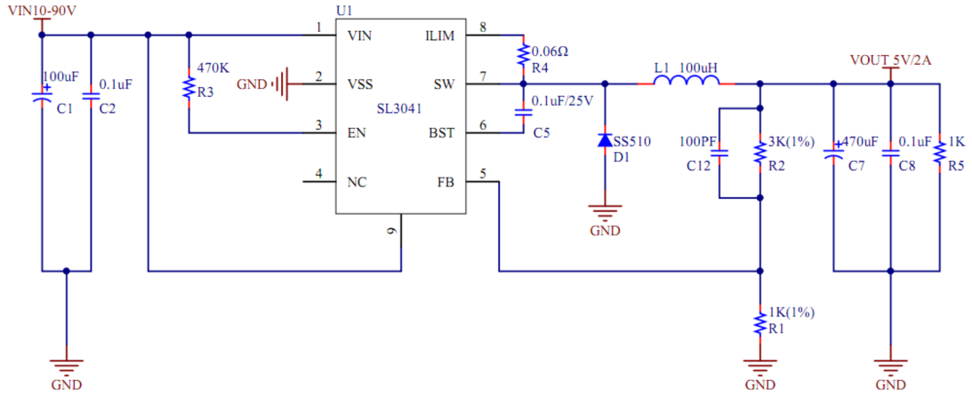 SL3041 是一款内部集成有功率MOSFET管可设定输出电流的降压型开关稳压器。可工作在宽输入电压范围具有优良的负载和线性调整。宽范围输入电压(10V至100V)可提供最大3A电流的高效率输出,可在移动环境输入的条件下实现各种降压型电源变换的应用。
