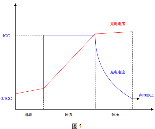 理论上为了防止因充电不当而造成电池寿命缩短,我们将电池的充电过程分为四个阶段:涓流充电(低压预充,此状态 的电池电压比较低,实际使用时,建议将锂电池欠压保护点提高,避免电池出现过放电现象)、恒流充电、恒压充电以及充 电终止。典型的充电方式是:先检测待充电电池的电压,在电池电压较低情况下,先进行预充电,充电电流为设定的最大充 电电流的 1/10,当电池电压升到一定值后,进入标准充电过程。标准充电过程为:以最大充电电流进行恒流充电,电池电压 持续稳定上升,当电池电压升到接近设定的最大电压时,改为恒压充电,此时,充电电流逐渐下降,当电流下降至最大充电 电流的 1/10 时,充电结束。图 1 为充电曲线: